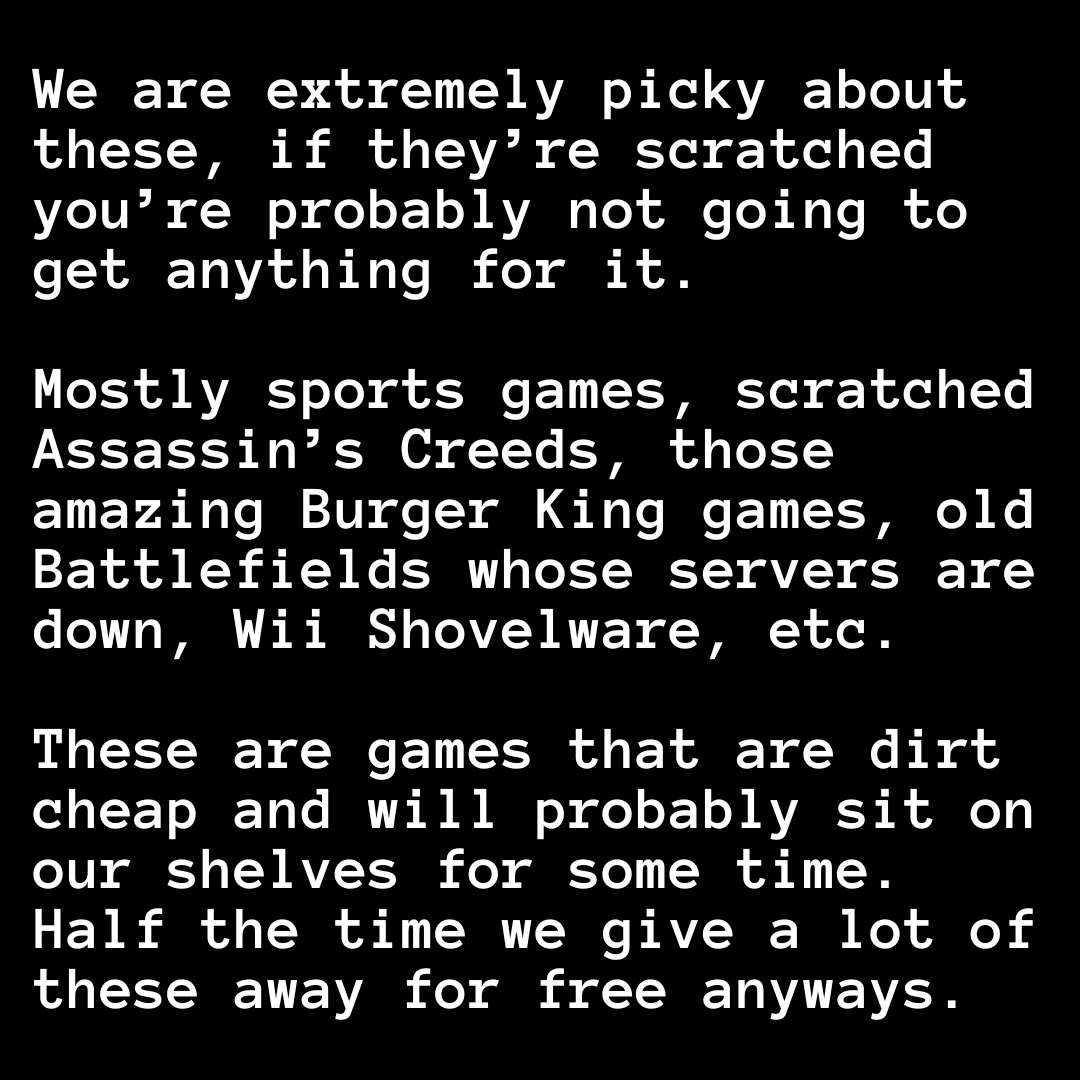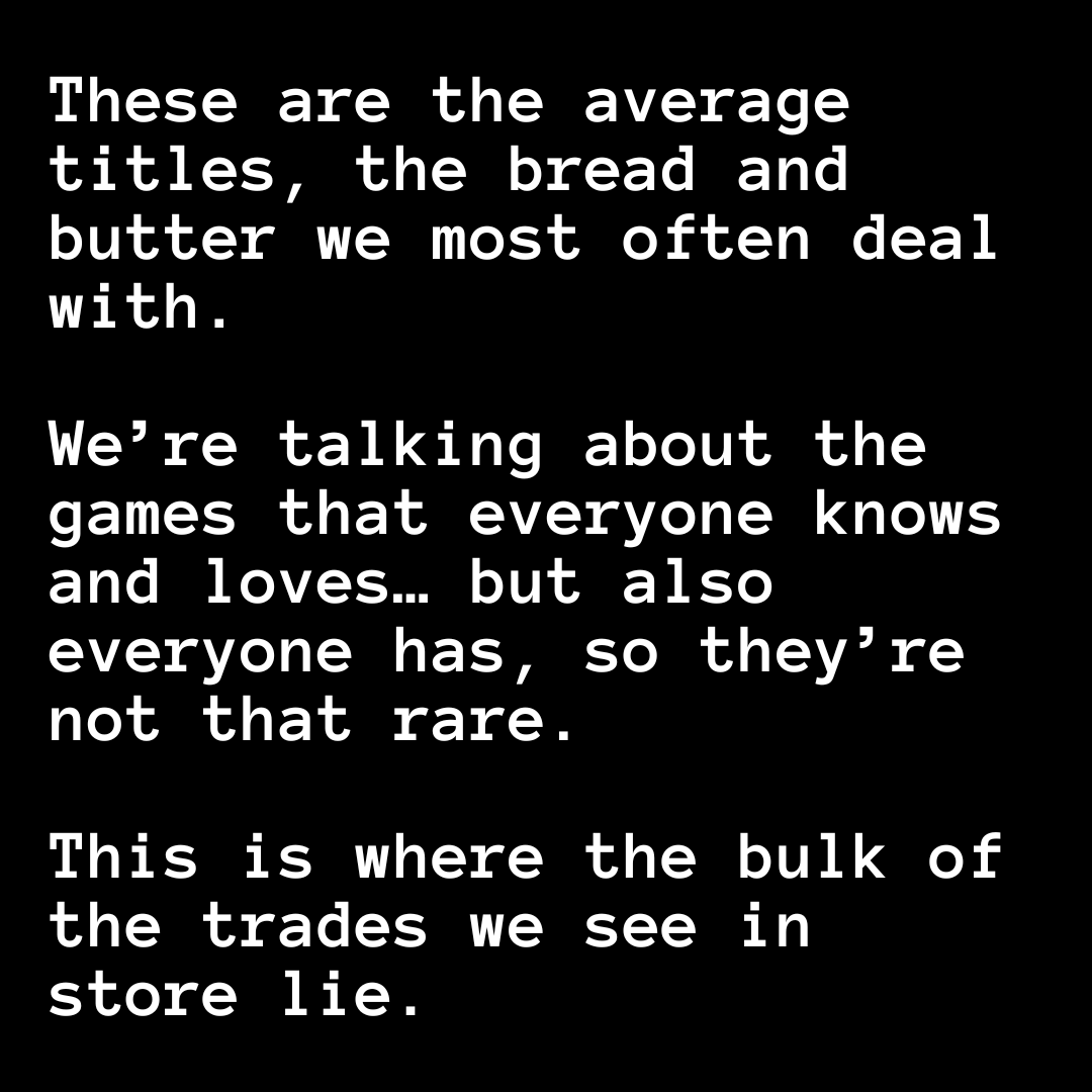 We love video games so much that we see everything in video game terms. For our trade-ins, we like to think of them in terms of video game loot tiers and we treat them accordingly. Here’s a brief outline of how we do our trades. All of the following information is subject to change and employee discretion, especially in regards to the condition of the product. This is just to give you a general idea before you haul your collection over to us.