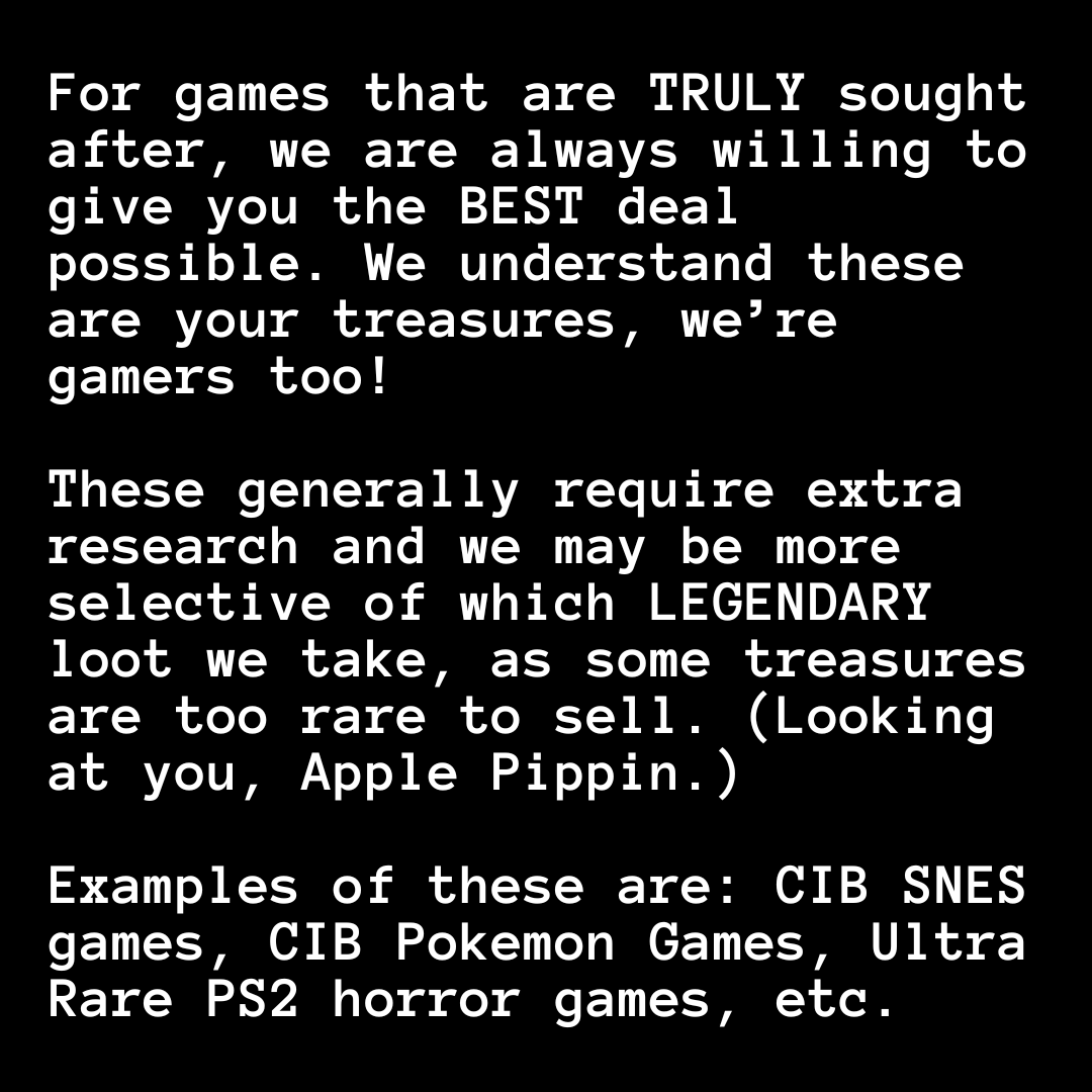 Note that the majority of what’s considered “Market Value” Will be determined by Pricecharting, sales records, eBay “Sold As” numbers (not what it’s listed for), and our competition.